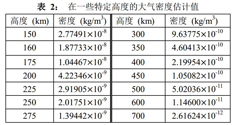 通過查閱相關參數(shù)數(shù)據(jù)得到衛(wèi)星質(zhì)量m=13200kg, 并假設衛(wèi)星受阻面積為16m2, 對地軌道速度為7800 m/s, 即Ma= 22.9. 從表 1中我們可以得到相應的CD=0.11283. 從ρ(h)函數(shù)關系可以解出如下表所示的在一些特定高度的大氣密度估計值.