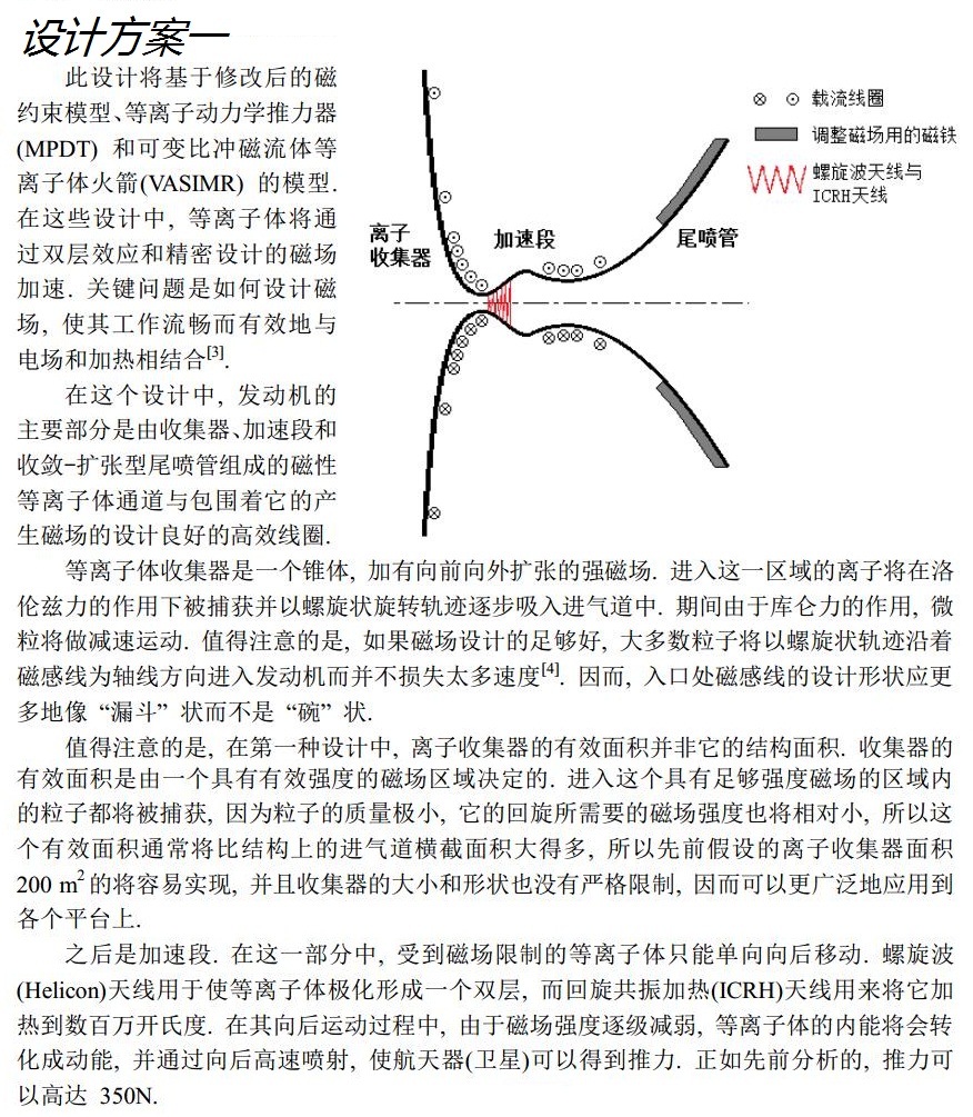 這一事實讓我想起了使用的離子推進器的衛(wèi)星, 如SMART和DAWN衛(wèi)星等. 離子推進器的廣泛應用說明了人類在短距離小空間內(nèi)加速離子的技術日臻成熟. 這也同時讓我考慮到一個新的模型——融合傳統(tǒng)離子推進器和沖壓發(fā)動機的設計, 讓等離子體代替空氣進入進氣道, 然后使用電場和磁場來加速, 以取代化學燃料的燃燒. 這就是我的想法的概述.
