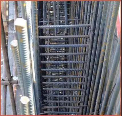 鋼筋加工:I級鋼筋末端需做180°彎鉤,彎曲直徑D取鋼筋直徑d的5倍,平直部分長度取鋼筋直徑d的5倍;箍筋彎鉤135°、平直部分長度取10 d。鋼筋定位鋼筋端頭應(yīng)切齊、磨去飛邊毛刺,端頭刷防銹漆。
