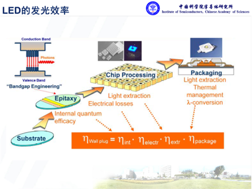 氮化鎵是直接帶隙的半導體材料,在光電應用方面具有獨特優(yōu)勢。基于氮化鎵的HB-LED對于通用照明來說,其核心問題是發(fā)光效率。其中外量子效率主要取決于三個層面的因素,內量子效率、光提取效率,還有封裝方面的熒光轉化等效率,而且每個環(huán)節(jié)都息息相關。
