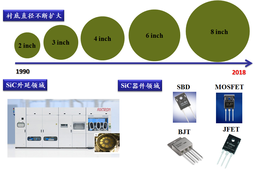 碳化硅材料的發(fā)展是非常迅速的,從1990年開(kāi)始,2英寸的碳化硅出現(xiàn)之后,到2015年8英寸的碳化硅也已經(jīng)出現(xiàn)了,但是8英寸的碳化硅材料質(zhì)量還不夠成熟,現(xiàn)在最成熟的是4英寸和6英寸的?,F(xiàn)在量產(chǎn)的情況是4英寸晶片在往6英寸轉(zhuǎn),有一些國(guó)外的企業(yè)已經(jīng)大規(guī)模使用6英寸碳化硅了,目前國(guó)內(nèi)有很多6英寸硅的生產(chǎn)廠,把硅的設(shè)備改成碳化硅的設(shè)備,再添加一些碳化硅專用設(shè)備,就可以進(jìn)行6英寸碳化硅的流片。