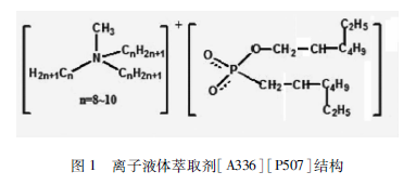 近年來(lái)我們開(kāi)展離子液體萃取劑的研究,例如[A336 ] [ P507]。該結(jié)構(gòu)簡(jiǎn)單的理解就是將P507進(jìn)行有機(jī)錢鹽的皂化,有機(jī)錢鹽常采用Aliquat336,國(guó)內(nèi)商品名稱為N263。[ A336 ] [ P507]的結(jié)構(gòu)如圖1所示,是一種典型的離子液體,所以我們稱之為離子液體萃取劑。