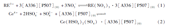 離子液體萃取稀土離子的過(guò)程機(jī)理還是比較復(fù)雜的,這種復(fù)雜來(lái)自于很多方面。其萃取稀土(III)和缽( IV)的機(jī)理還是以中性絡(luò)合機(jī)理為主,如萃取平衡方程(1)和(2)所示,同時(shí)可能還伴隨一些副反應(yīng)。該過(guò)程萃取稀土鹽,酸堿消耗比較小,是提高稀土萃取效率的重要方式之一。