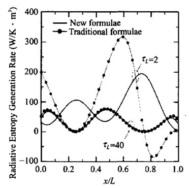 利用輻射熵的定義這樣的一個基本關(guān)系式,結(jié)合輻射傳遞方程,可以導(dǎo)出類似于輻射能傳遞的半透明介質(zhì)內(nèi)輻射熵傳遞方程。根據(jù)輻射熵傳遞方程可獲得局部輻射熵產(chǎn)率計算公式,包括吸收發(fā)射熵產(chǎn)和散射熵產(chǎn)兩部分。通過輻射擁的定義,再做適當?shù)臄?shù)學推導(dǎo),可以得到輻射[火用]的傳遞方程。這樣的做法得到的結(jié)果能不能符合傳統(tǒng)的熱力學關(guān)系呢? 加拿大有一個學者認為輻射熵產(chǎn)和輻射[火用]損之間不服從Guoy-Stodola關(guān)系,但是我們發(fā)現(xiàn)還是符合的。前面講到一些傳統(tǒng)公式不能用,假設(shè)一個溫度分布,我們同時用傳統(tǒng)公式和這個新局部熵產(chǎn)率分布比較公式來分析計算半透明平板內(nèi)輻射傳輸問題。如圖3所示,用傳統(tǒng)的公式計算,計算結(jié)果會出現(xiàn)熵產(chǎn)為負的現(xiàn)象,而用新公式算出來的結(jié)果不會出現(xiàn)這種現(xiàn)象。我們發(fā)現(xiàn)輻射和導(dǎo)熱在光學厚條件下是相類似的,此時熱輻射問題可按導(dǎo)熱問題類處理,輻射熵產(chǎn)的計算也是如此。