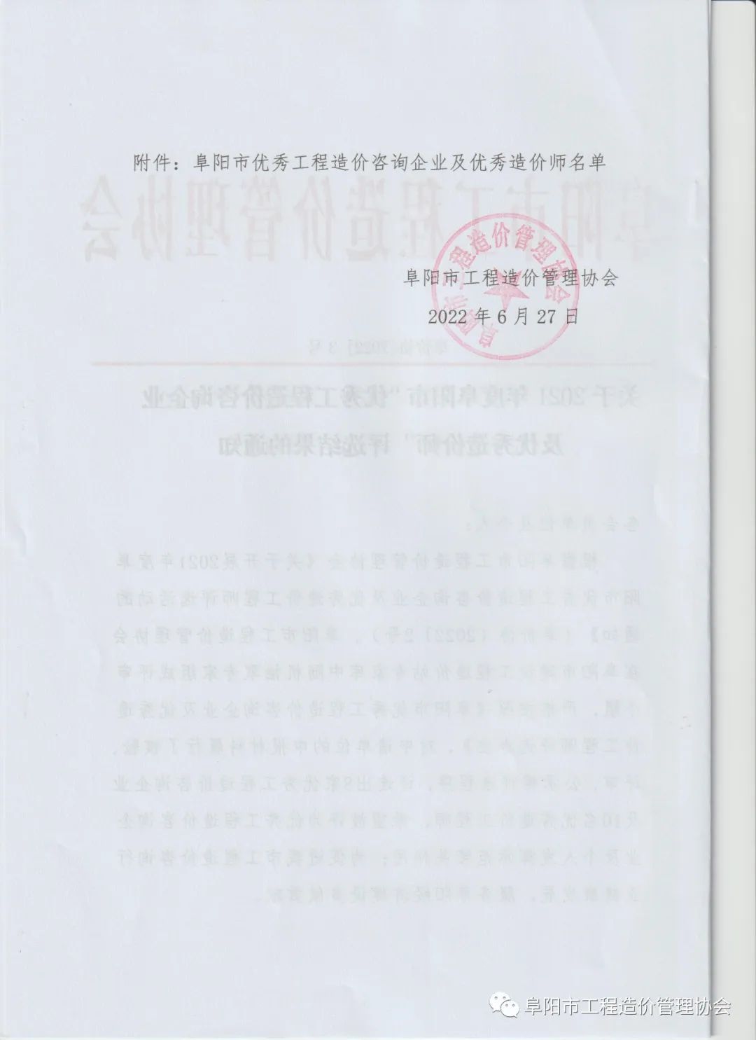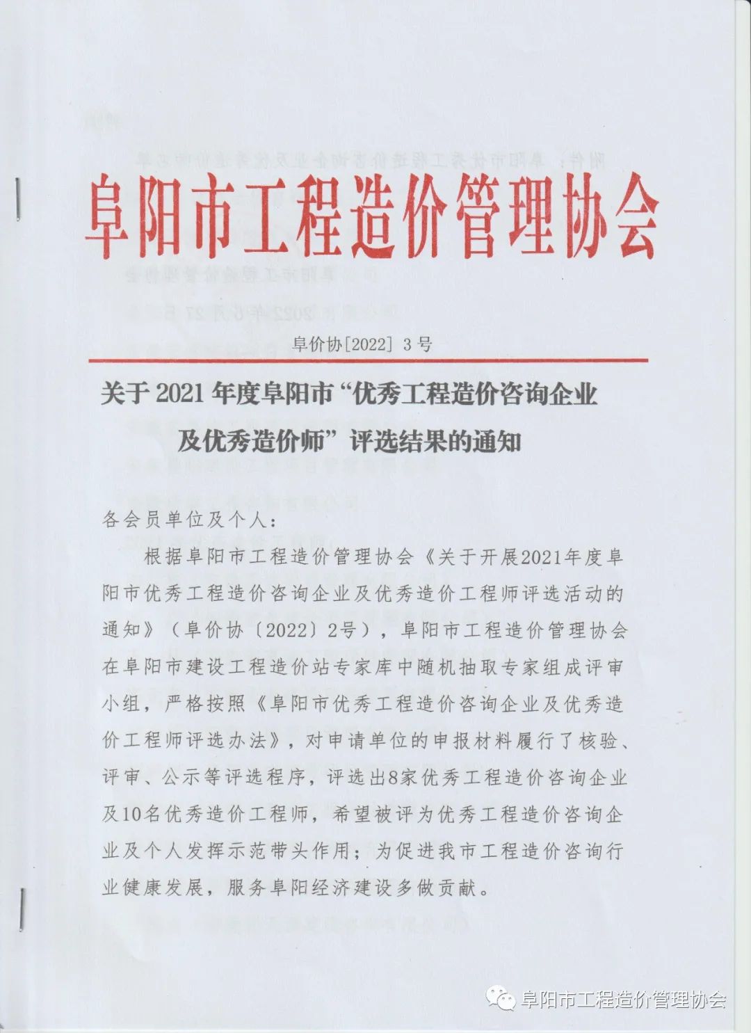 關(guān)于2021年度阜陽市“優(yōu)秀工程造價咨詢企業(yè)及優(yōu)秀造價師”評選結(jié)果的通知